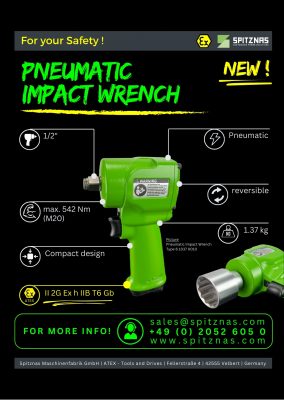 For working in tight spaces, the SPITZNAS 1/2-inch pneumatic impact wrench is the perfect tool. ATEX approval included!