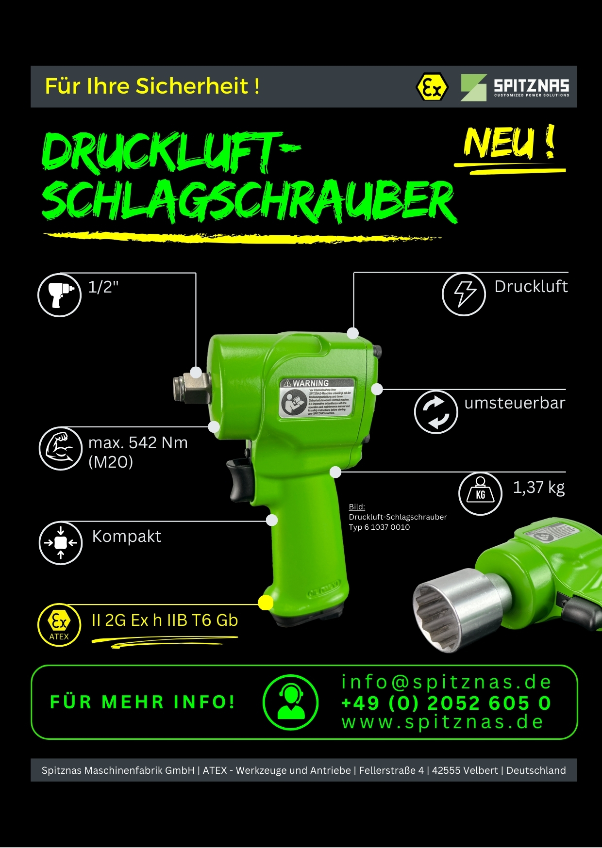 Für Arbeiten auf engsten Raum ist der SPITZNAS 1/2-Zoll Druckluft-Schlagschrauber genau das richtige Werkzeug. ATEX-Zulassung inklusive!